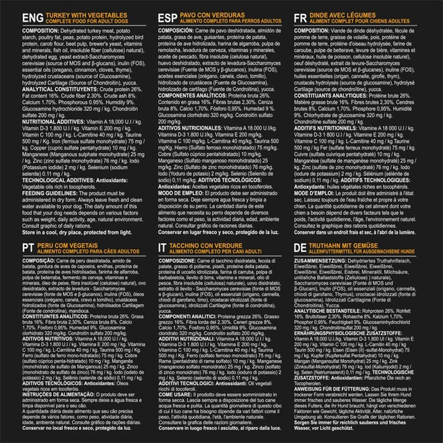 Croquettes pour chiens adultes, sans céréales, sans gluten, à base de dindon et de légumes. Riche en protéines et en glucides. Hypoallergénique et mon protéique. Avec des ingrédients naturels et sans conservateurs. Idéal pour la santé des os et des articulations.