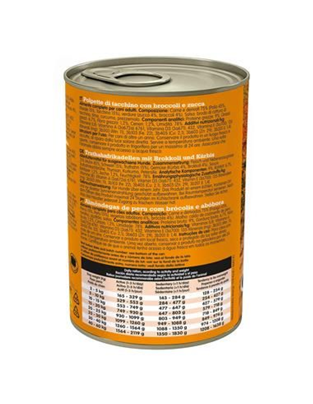 Composition: Viande et dérivés 75% (Poulet 45%, Porc 15%, Dinde 15%), légumes (citrouille 4%, brocoli 4%). Sauce: bouillon de cuisson de dinde, thym, curcuma, persil.