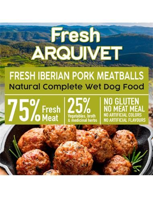 Boulettes de viande de porc ibérique, aliment complet pour tous types de races de chiens adultes, avec un pourcentage élevé de viande fraîche, ce qui les rend très appétissantes, savoureuses et digestes. Avec des ingrédients naturels locaux et durables, cuits à feu doux pour obtenir une recette à haute valeur nutritionnelle. Sans gluten, sans farine de viande, sans colorants ni arômes artificiels.