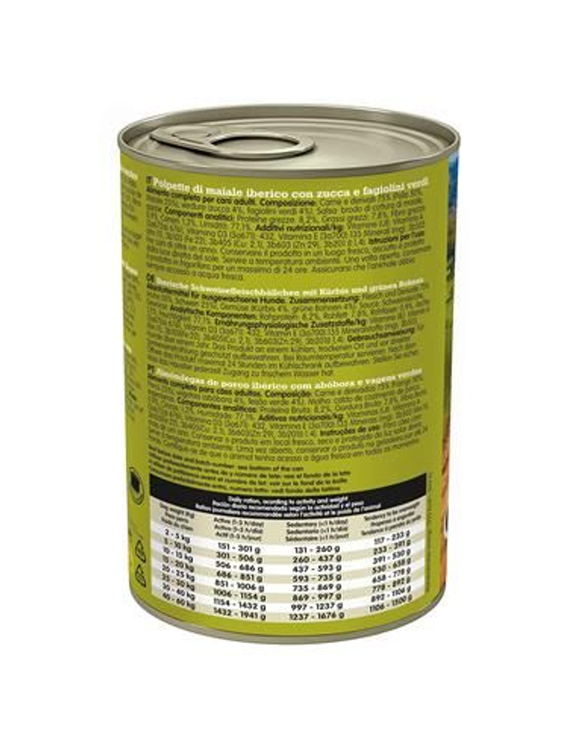 Composition: Viande et dérivés 75% (Poulet 50%, Porc 25%), légumes (citrouille 4%, haricots verts 4%). Sauce: bouillon de cuisson de porc, épices.